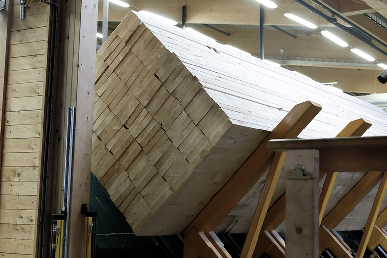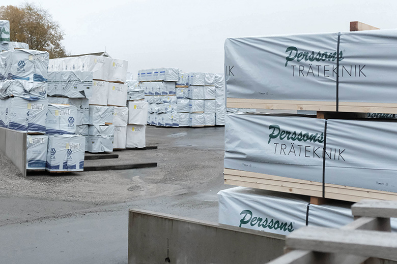 Produktionen hos Perssons Träteknik består till största delen av hyvleri, måleri, takstolstillverkning och lager. Varje dag passerar stora mängder virke genom de olika produktionsleden. Första anhalten i anläggningen är lagerplatser för obehandlat material som kommer in till oss. I genomsnitt får vi varje dag virkesleveranser från 3-4 fullastade långtradare med släp.