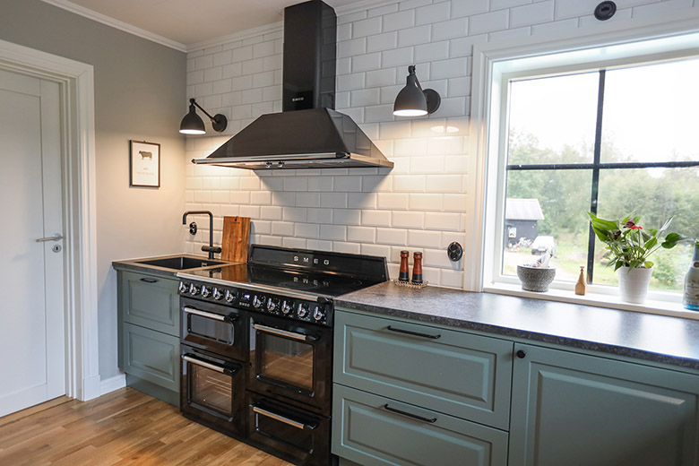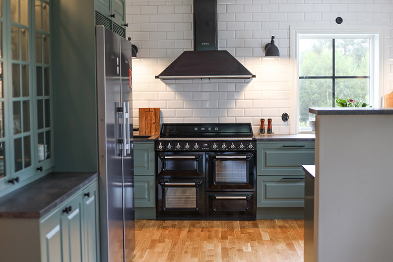 Det gröna köket passar fint ihop med de svarta detaljerna och den pampiga spisen från SMEG.