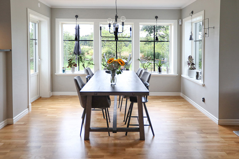 Utbyggnaden gör att de får plats med ett stort matsalsbord för många gäster.