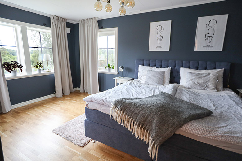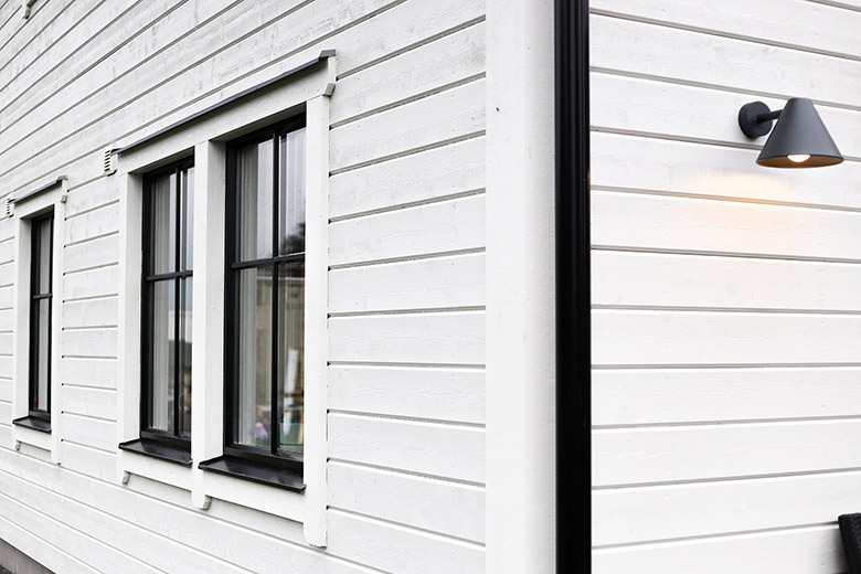 När man rullar in på gården och möts av det vackra huset är det första man lägger märke till den karaktäristiska kombinationen av vit och svart. Den liggande träpanelen är vit och som en snygg kontrast är fönstren, hängrännorna och taket svart. De svarta detaljerna är även genomgående invändigt i huset. Lägg märke till detaljer som duschväggar, blandare och eluttag som också är svarta.