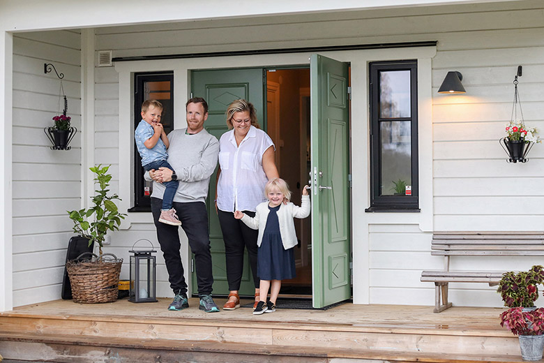 Platsen där Theresia Wallberg och Stefan Sjögren bor med sina två barn kallas för Sjömaden. Gården omringas av en gärdsgård och i den lummiga trädgården är äpplena redo att skördas. Att detta var en byggarbetsplats för bara ett år sedan är svårt att tro, men i november 2020 stod familjens hus klart och det var äntligen dags att flytta in.