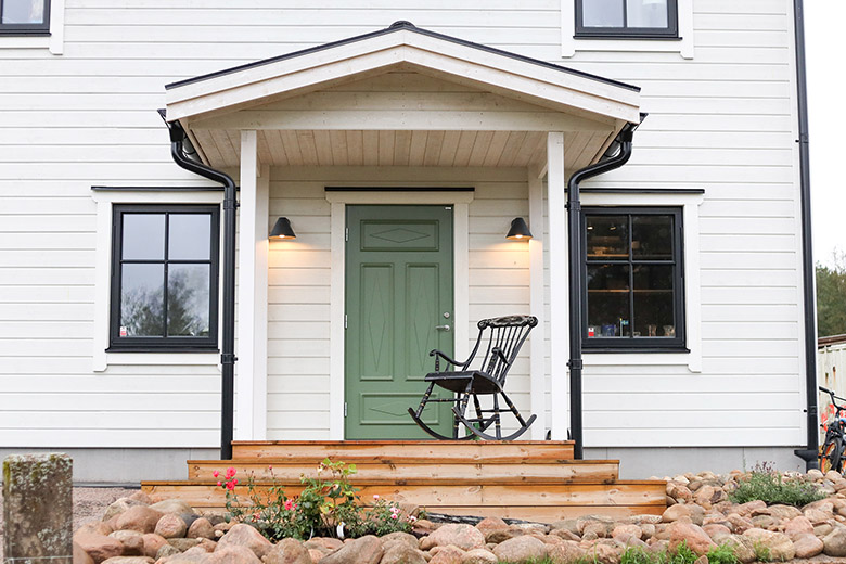 Husets fina groventré med tak där gungstolen bidrar till känslan av en amerikansk veranda.