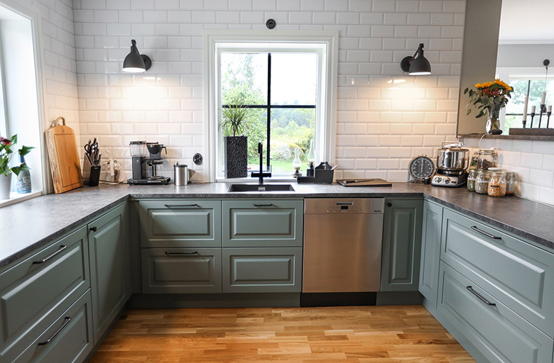 Kök, svart fläkt, gröna underskår. Lantligt.