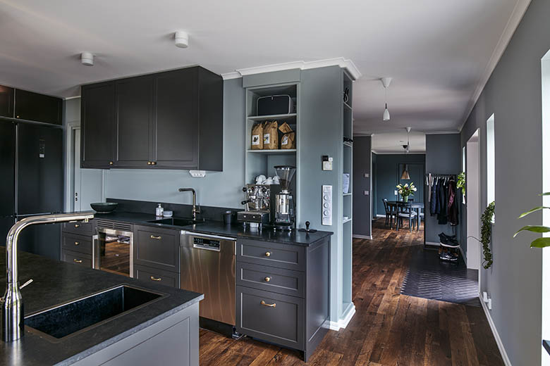 Maria och Fredrik var noga med att skapa ett hem som passade just dem. Praktiskt nog delar de samma smak. God mat och dryck är dessutom ett gemensamt intresse och i huset finns både ett skafferi man går in i och ett svalt vinförråd. Köket är väl tilltaget och i mitten står en köksö med spis, vask och plats för fyra stolar. Många av möblerna är loppisfynd som de sedan renoverat och målat om i färger som går ton i ton med inredningen.