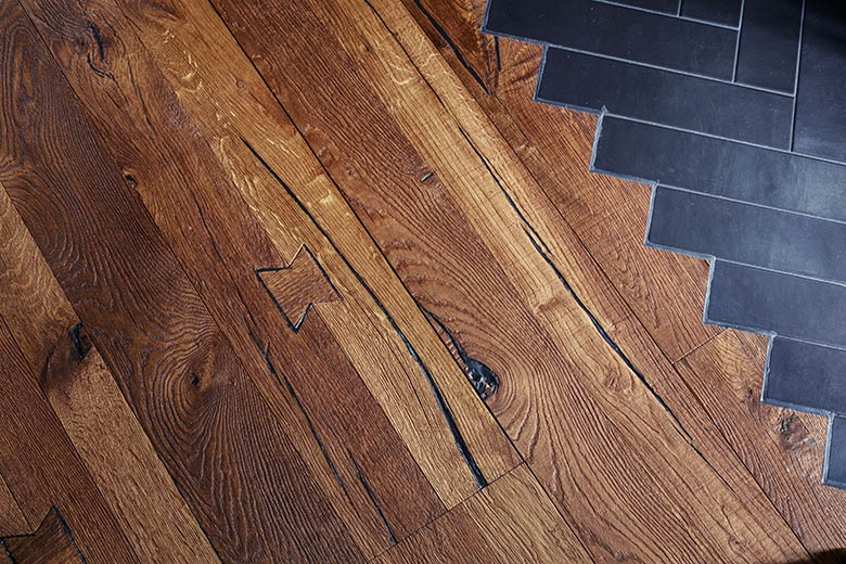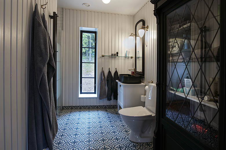 Husets dova men ändå kraftfulla naturfärger samspelar fint med det generösa ljusinsläppet. Den gedigna och jordnära känslan förstärks ytterligare med det rustika trägolvet som på ett effektfullt sätt möts upp av plattor i fiskbenssättning i hallen.