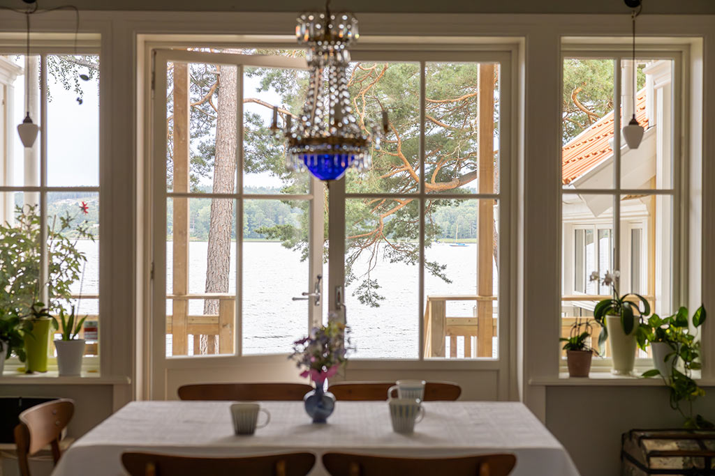 “Det känns helt fantastiskt att vi bor här nu! Sådär soliga och fina dagar är det som att vara i paradiset. Det absolut bästa är nog när man vaknar på morgonen och ser utsikten, men min favoritplats i huset är ändå orangeriet. Att hitta en sjötomt stod högt på vår önskelista så detta är verkligen en dröm. Den enda baksidan med att bo vid en sjö är väl att det blåser ibland”, säger Kaisa och ler.