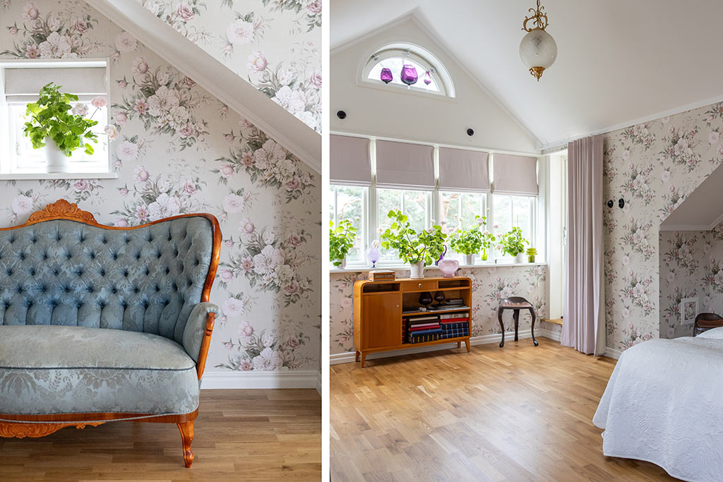 Kaisa och Andreas har också tagit andra beslut som bidrar till att skapa den där charmiga atmosfären av att gammalt möter nytt. Det gedigna plankgolvet som ligger på entréplan är i gran. Ett golv som är otroligt vackert men som kräver både muskler och kärlek när det ska skuras, helst varannan månad. Även pärlsponten i taket ger den rätta känslan. Paret valde att tillåta kvistar i panelen vilket ger en härlig struktur och liv till ytan.