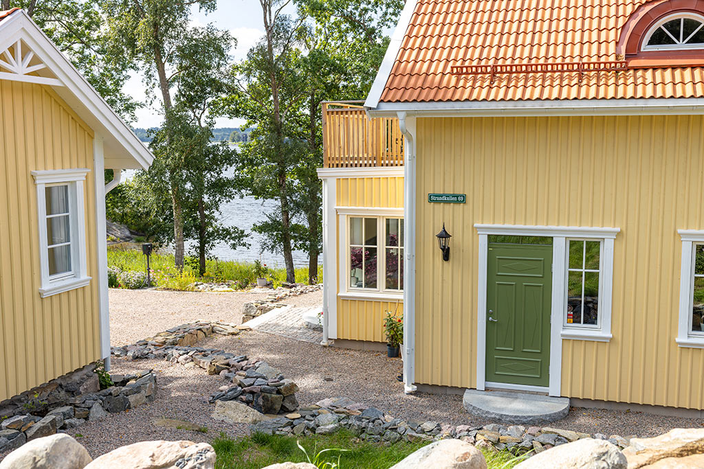 Det gula huset med vita knutar pryds av en ytterdörr i en grön kulör. På taket ligger tvåkupigt lertegel.