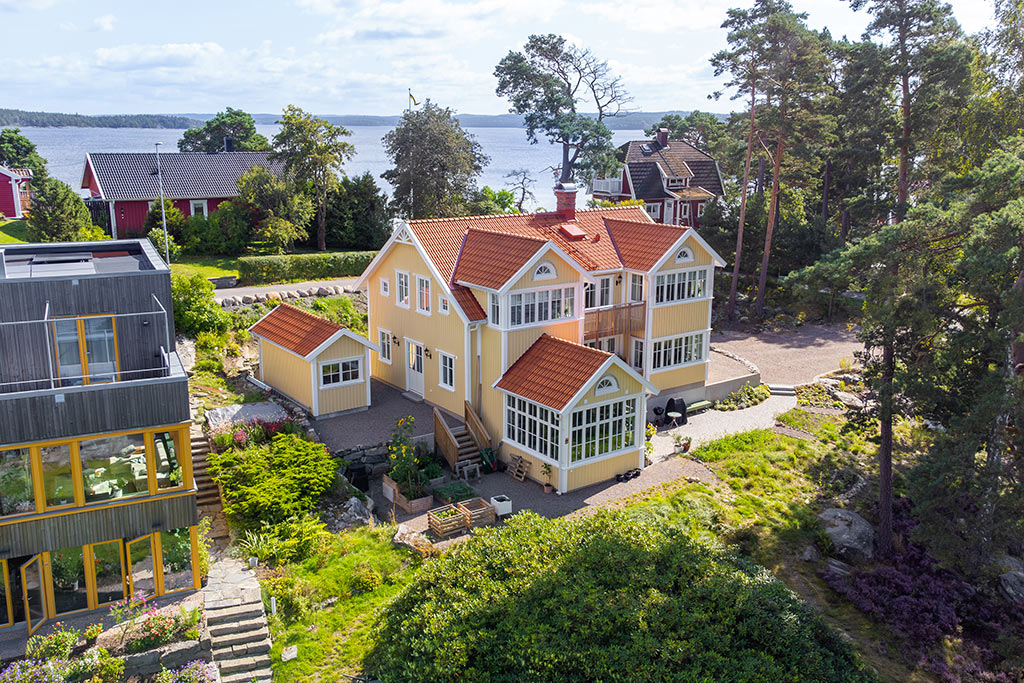 Den otroligt vackra villan som målats i en gul nyans med vita knutar stod klar i mars 2023. Det var under våren 2021 som paret köpte tomten och att ha gått igenom ansökan om strandskyddsdispens, bygglovsansökan, materialval och utformning av huset samt byggnation på bara två år är kort tid.