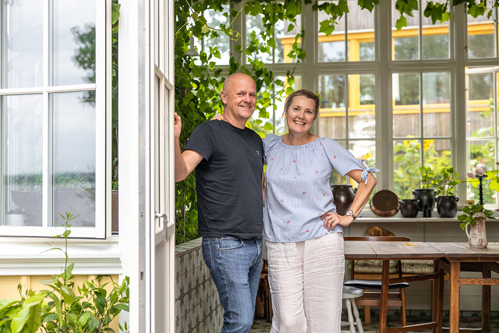 “Det är Simon på Alingsås Huspaket som har ritat vårt hus. Han utgick från ett hus som de kallar för Villa Klinten, men när vi hade kommit med alla våra önskemål och ändringar så slutade det med att Simon hade ritat om alltihop”, säger Kaisa glatt och fortsätter. “Det viktigaste för mig var att ha ett orangeri och ett skafferi, och att få plats med den här kakelugnen som är bevarad från slutet av 1800-talet. Vi har verkligen fått in allt vi önskade här.”