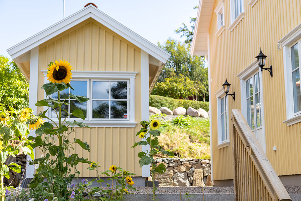 På sidan som vetter mot den lilla vägen finns en dörr till groventrén och en grusgång till det gamla fiskartorpet (vänster i bild) som låg här när de köpte tomten. Torpet har renoverats då det var i dåligt skick.