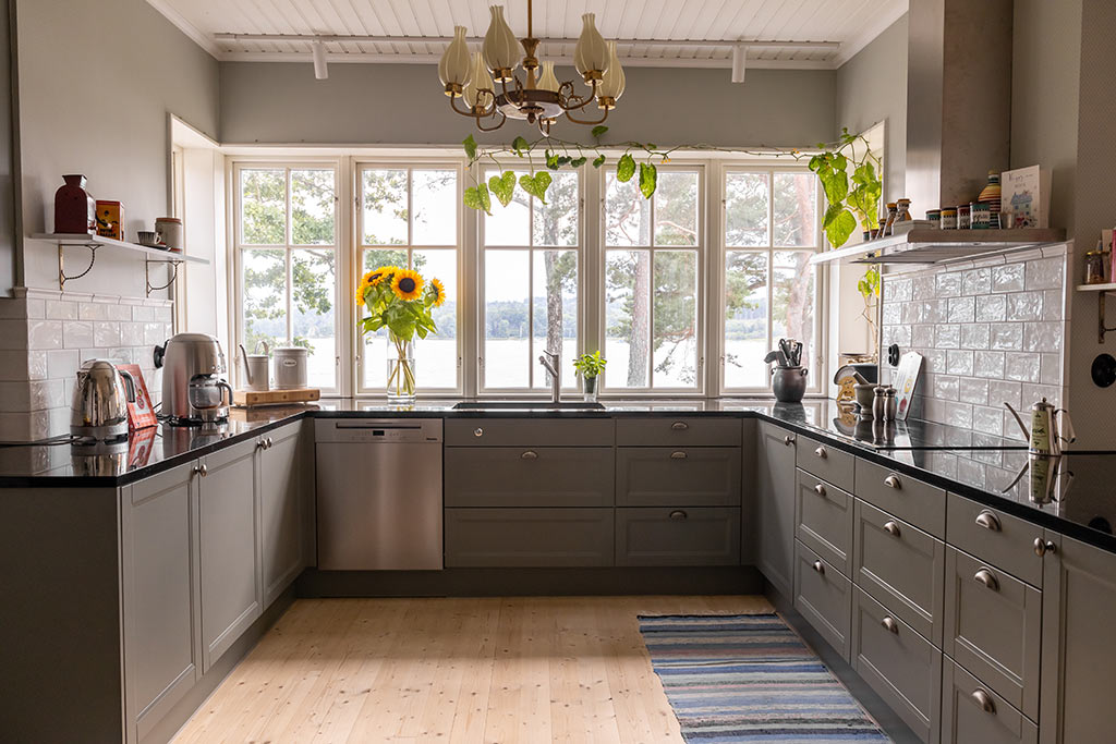 Köket ligger i en av husets utbyggnader och fönstren i bänkhöjd förstärker utsikten över sjön. Här finns också ett rymligt skafferi.