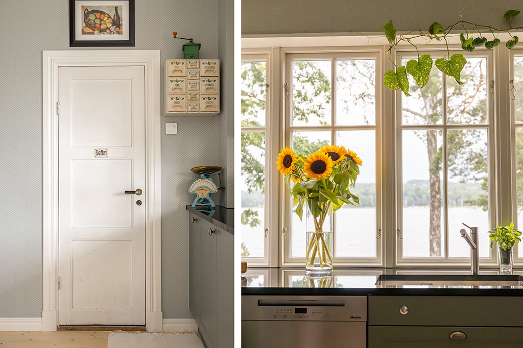 Kök med stora fönster.Dörr till skafferi och detaljbild på köket.