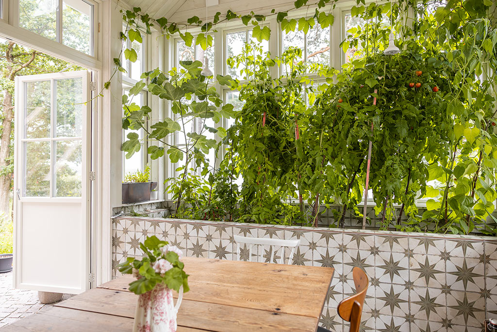Här odlar Kaisa bland annat tomater, chili, fikon och gurkor. Från orangeriet kommer man direkt ut till trädgården.