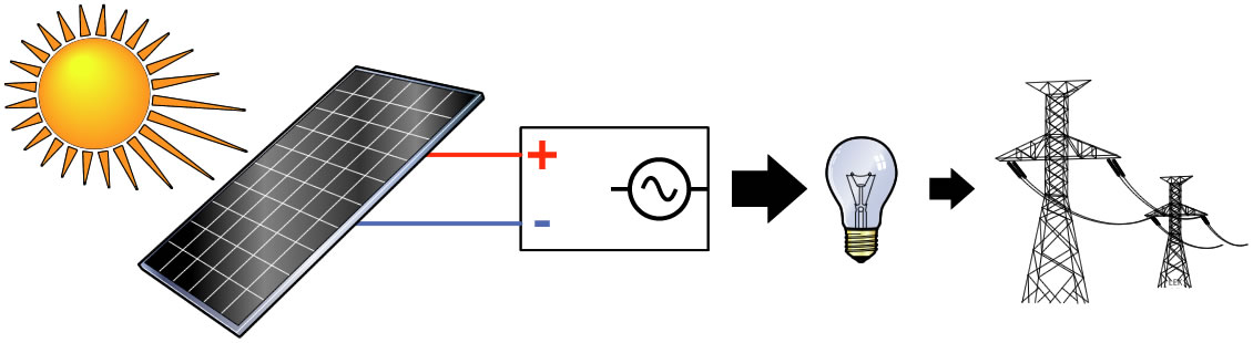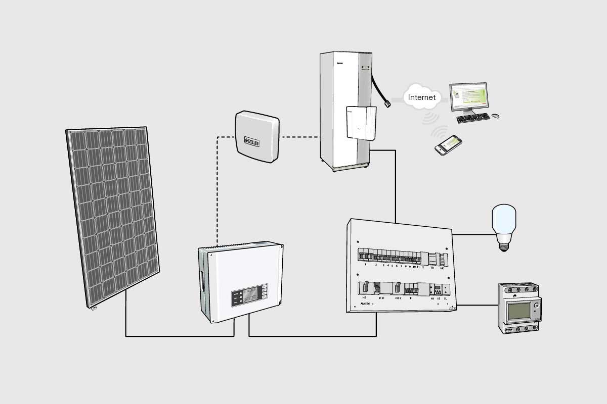 Bilden ovan visar hur solenergins flöde i huset ser ut. Från solcellerna på taket går solenergin in i en växelriktare som omvandlar likström till växelström. Växelriktaren placeras till exempel i ett teknikrum eller groventré och kopplas till husets vanliga elcentral, som i sin tur är kopplad till elnätet. Från elcentralen skickas strömmen vidare ut till kaffebryggare, belysning, värmepump och annat som behövs. På den streckade linjen ovan sitter kommunikationsmodulen som gör att växelriktaren och värmepumpen kan “prata” med varandra.