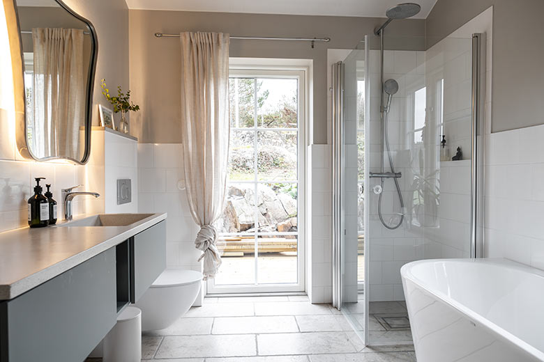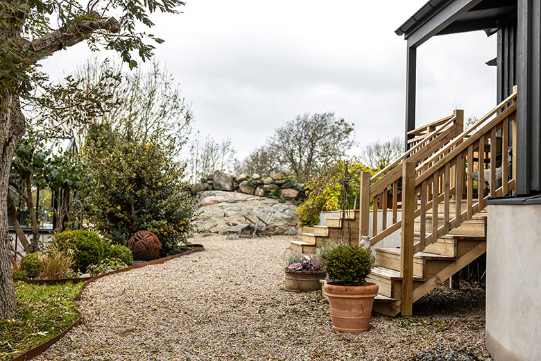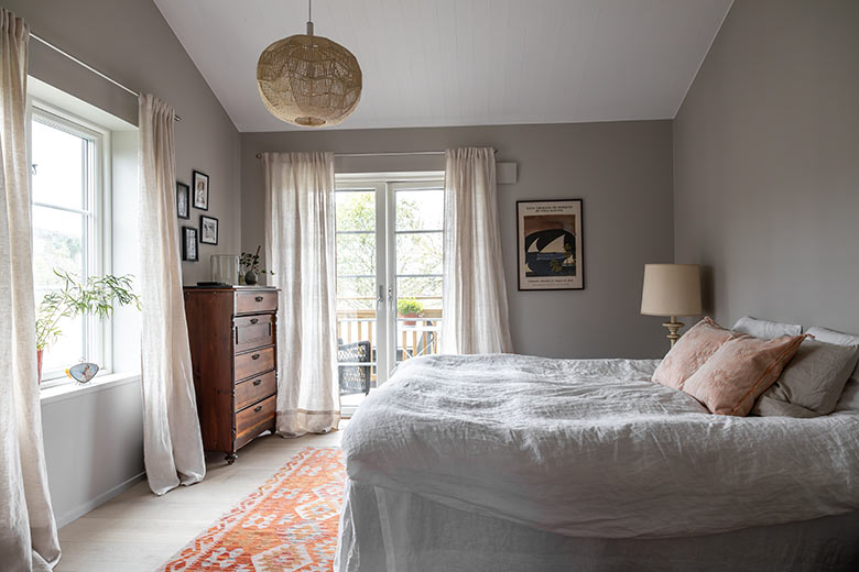 En av fördelarna med att paret har bott på platsen tidigare är att de haft väldigt bra koll på väderstreck och alla lägen på tomten. De gillar att vara utomhus och såg till att sätta in fler dörrar än vad som fanns i det tidigare huset. Alla rum, förutom de små gästrummen, har minst en utgång till någon av altanerna. Det ska vara lätt att ta sig ut och på sommaren får dörrarna gärna stå öppna.