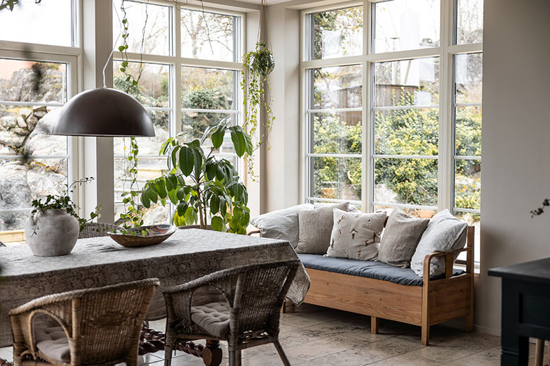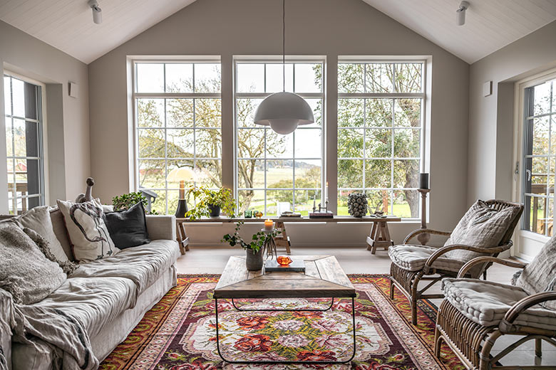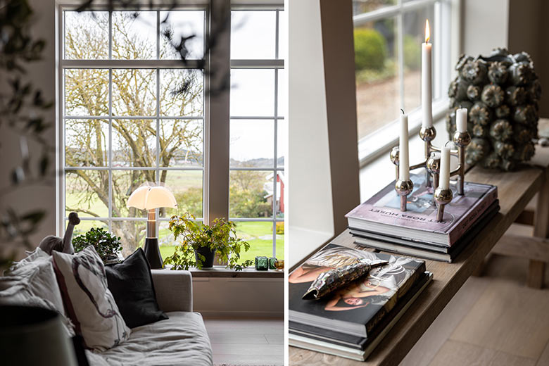 Genom de stora fönstren i vardagsrummet har man utsikt över åkrar och släktgården där Nettan spenderat sin barndom.