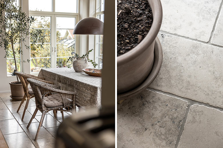 I burspråket har paret valt ett vackert golv av tumlad kalksten importerad från Italiten.