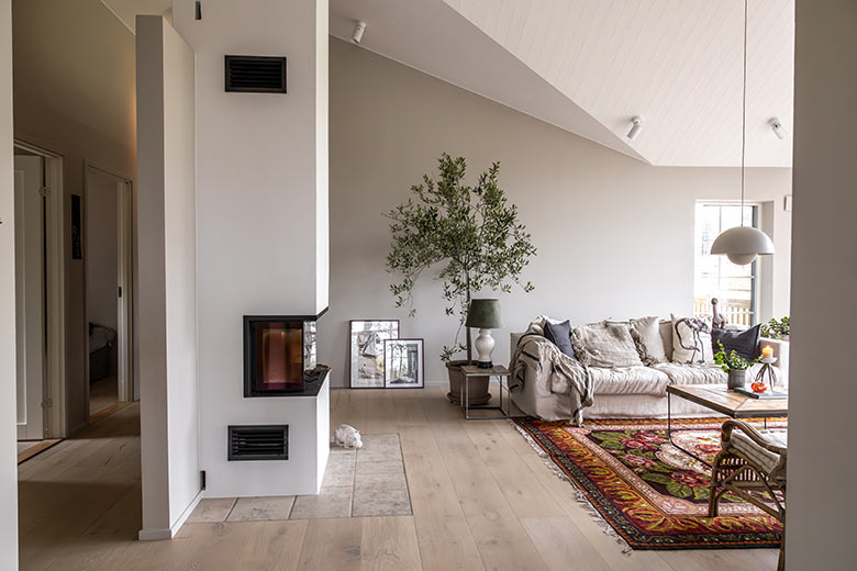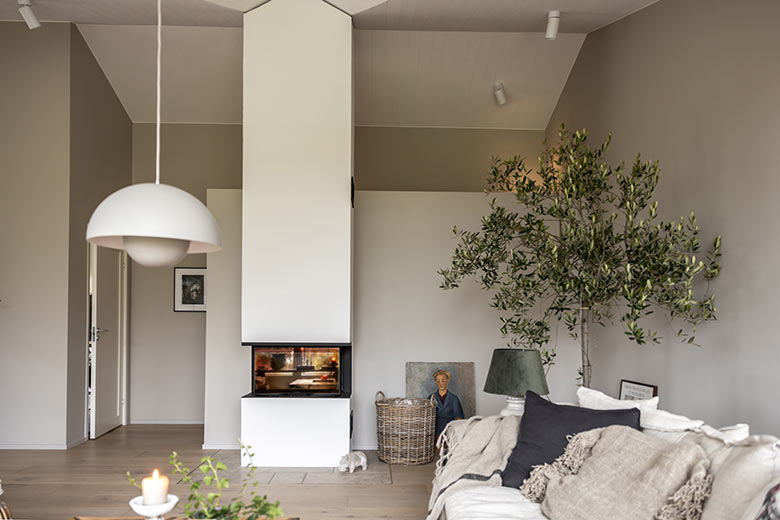 Parets vardagsrum har en platsbyggd öppen spis där man kan se elden från tre håll.