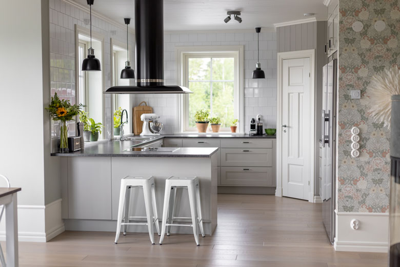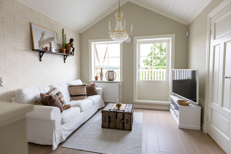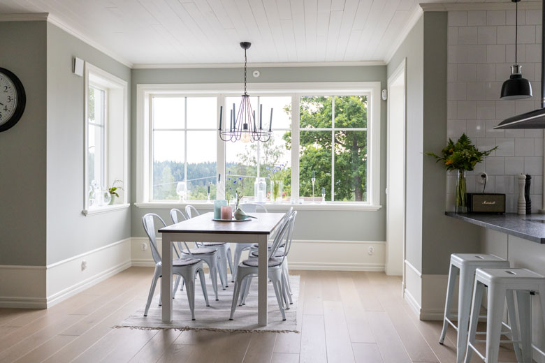 Varje detalj i huset är noga genomtänkt både stilmässigt och i utförandet. Takhöjden på 260 cm var något som var viktigt för paret redan från start. En vanlig takhöjd är 240 cm medan det hos Alingsås Huspaket är 250 cm som är standard. Med en högre takhöjd ville Rasmus och Liza även höja fönstren, så alla fönster är 20 cm högre än standard. Den förhöjda golvsockeln är en vacker detalj i interiören, och listen under fönsterbrädorna är en annan favorit. För att ta stilen hela vägen har paret dessutom valt att inte ha några spotlights i taket.