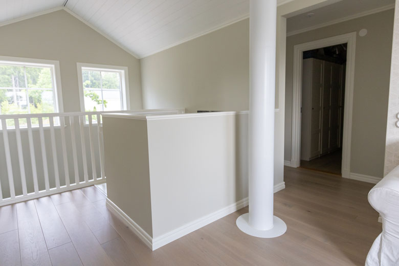 Utöver allrummet och badrummet på övervåningen finns det ett förråd, ett stort sovrum, ett kontor och ett barnrum.