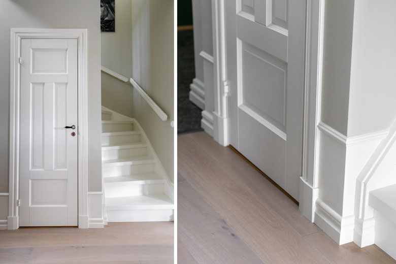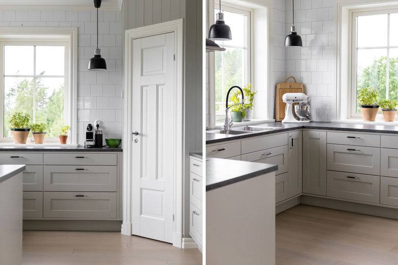 Skafferidörren är likadan som husets övriga innerdörrar fast extra smal. Modellen heter Massiv 4 och är från Diplomat.