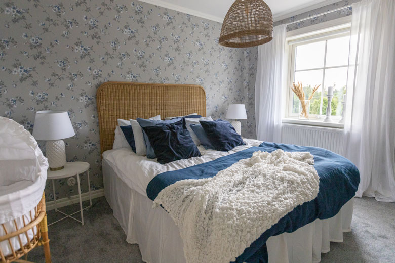 Rasmus och Lizas sovrum går i lugna blå toner och heltäckningsmattan hjälper till att skapa hotellkänsla.