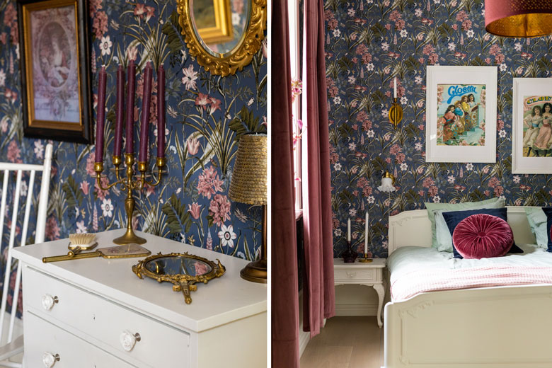 “Mycket inspiration får vi från Pinterest, där har jag hittat många olika idéer. Inspirationen till gästrummet kommer från hotell som Pigalle och Dorsia. Vi har inrett rummet med loppisfynd och saker från våra mor- och farföräldrar för att skapa en viss stil. Jag fick välja en tapet som jag fastnade för, det kändes kul att våga ta något udda som vi inte skulle ha valt i något annat rum. Liza är dock inte helt nöjd med resultatet. Hon säger att hon kanske tapetserar om någon dag när jag inte är hemma”, säger Rasmus och skrattar.