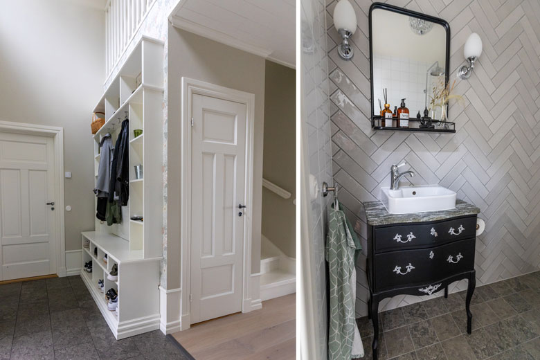 I hallen har de platsbyggt förvaring av restvirke och i badrummet har de gjort om en byrå till kommod.