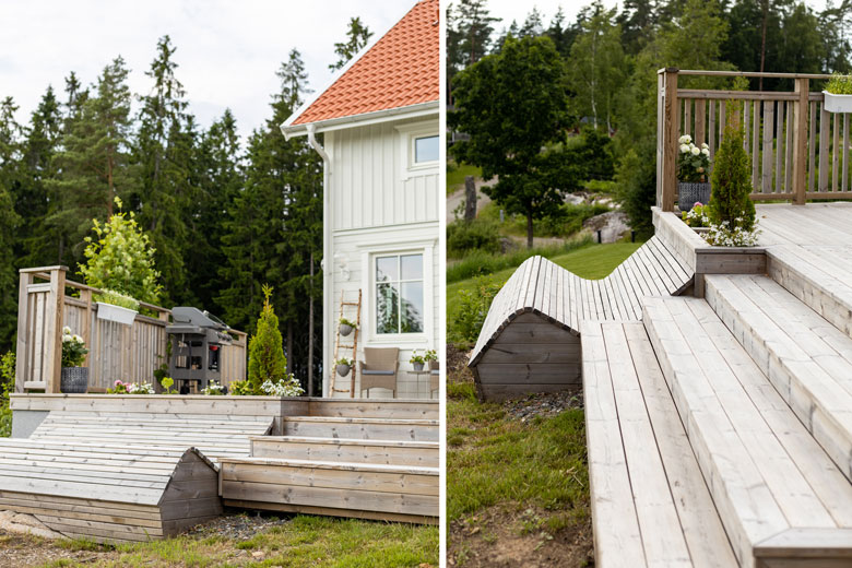 Idén till den härliga solstolen de byggt i kanten av altanen fick de från Pinterest.