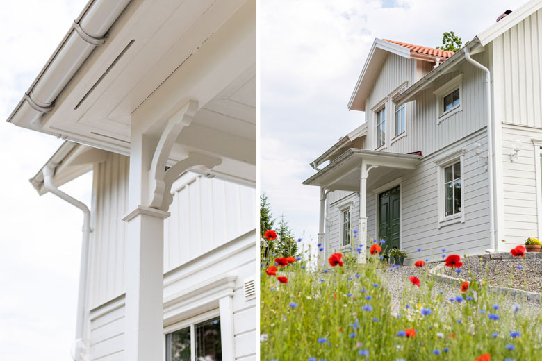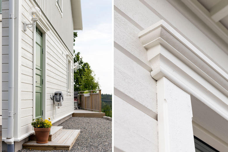 Fina detaljer kring både fönster och dörrar ger husets fasad det där lilla extra.