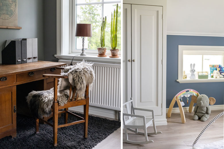 För bara några veckor sedan skedde en stor förändring i familjen då Rasmus och Liza fick sitt första barn. Liza har redan målat om i det ena sovrummet på övervåningen för att välkomna bebisen med ett eget rum och en väggmålning. Än så länge har paret inte upptäckt något som de borde gjort annorlunda i huset utifrån de behov som kommer med att skaffa barn. Kanske kommer förråden nu att fyllas snabbare, och hade kunnat vara ännu lite större.