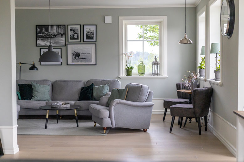 I vardagsrummet och matplatsen har väggarna en mycket behaglig nyans av grönt som heter Opal.