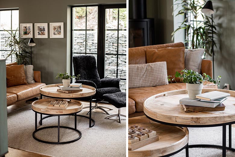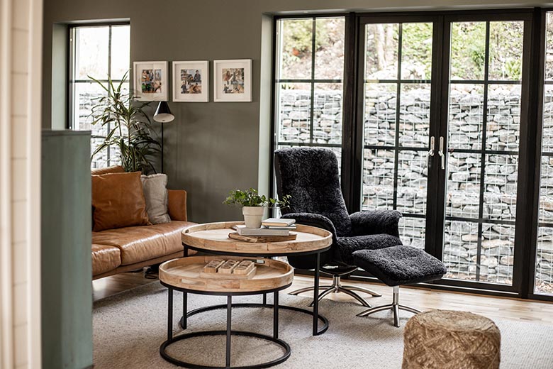 Inredningen går i jordnära toner med inslag av trä och svarta detaljer.