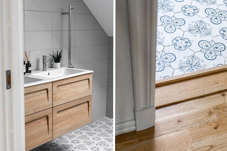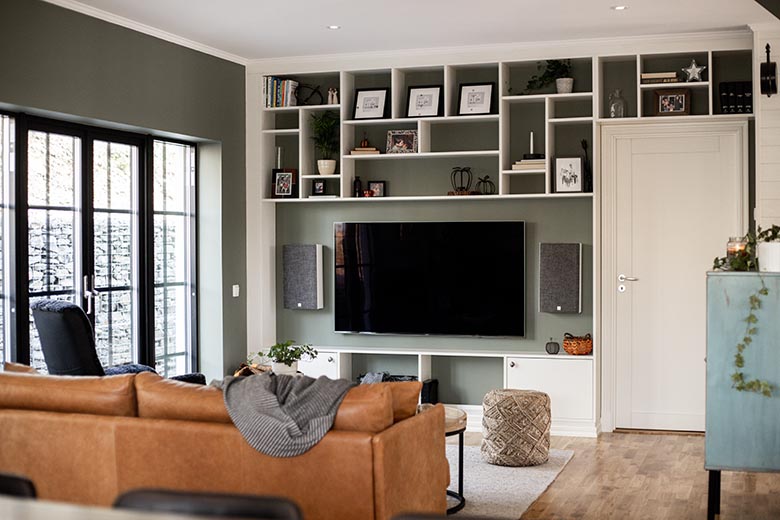 För att göra sitt hus mer personligt och uppnå stilen från Shellys moodboard valde paret att ta hjälp av en finsnickare till en del detaljer i huset, till exempel bänkskivan på köksön, kommoderna på bottenvåningen, den platsbyggda hyllan i vardagsrummet och den maffiga skjutdörren mellan sovrum och badrum. “Vi försökte att inte välja bort för många detaljer från Alingsås Huspaket för att ha så mycket som möjligt samlat på ett ställe. Varje detalj som väljs bort blir en ny kontaktyta för oss som vi behöver ta ansvar över,” säger Khasha.