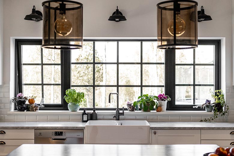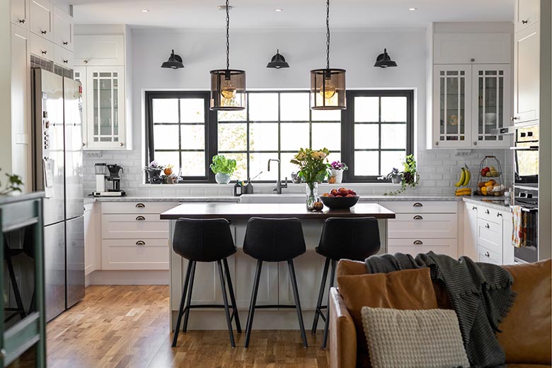 Detaljer som gett köket en amerikansk karaktär är bland annat symmetrin, de spröjsade svarta fönstren och den gedigna köksön.