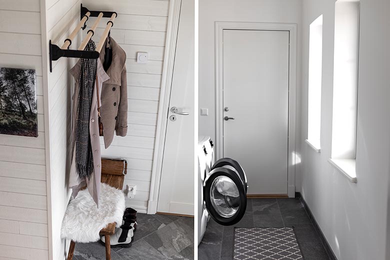 Från hallen finns en ingång till tvättstugan och från tvättstugan kan man gå innervägen till garaget.