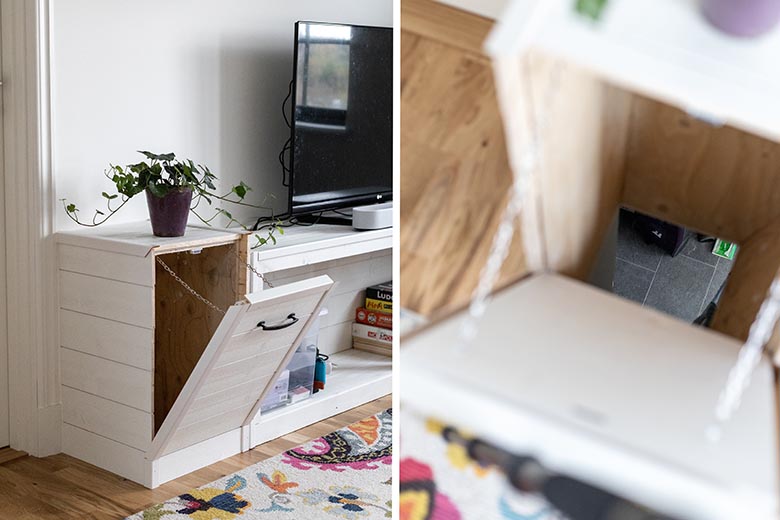 Från allrummet har paret byggt in ett tvättnedkast som går rakt ner till en garderob i tvättstugan.
