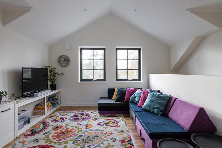 Barnens tre sovrum kompletterades med ett litet förråd i varje rum istället för att använda lösa garderober. Khasha fick även en tanke på om det gick att skapa lite mer rymd i allrummet på ovanvåningen. Då tog Alingsås Huspaket fram ett förslag på hur man skulle kunna öppna upp till nock i det rummet. “Det var verkligen helt otroligt bra att jobba med Alingsås Huspaket. De var jätteflexibla och sa aldrig nej till något!” säger Khasha.