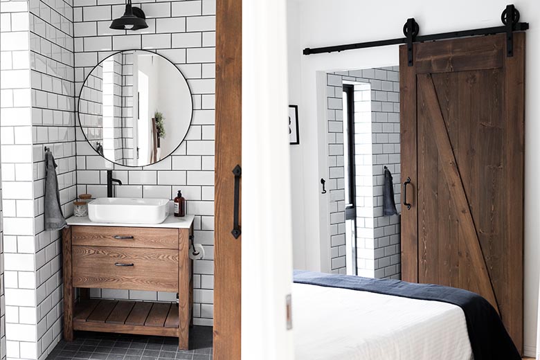 Kommoden i parets privata badrum samt den gedigna skjutdörren i trä är specialbeställda från ett snickeri.