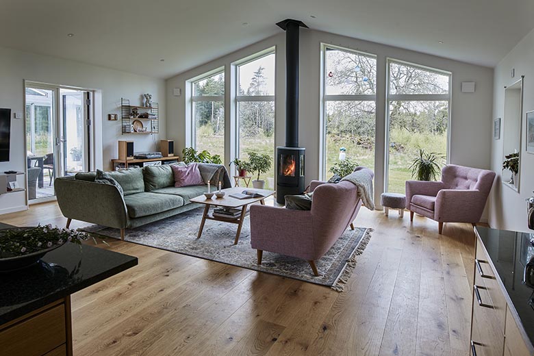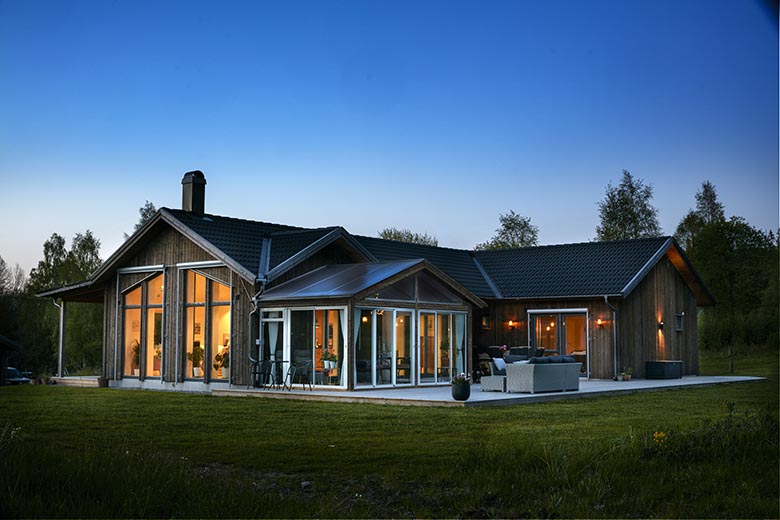 När valet av husleverantör tillslut föll på Alingsås Huspaket gick paret därefter igenom ett antal olika planlösningar. De förädlade dem och kom fram till att ett modernt enplanshus, med öppen planlösning och stora sällskapsytor, fungerade bäst för dem. Upplägget förenklar familjesammankomsterna med de fyra vuxna barnen och ett barnbarn.