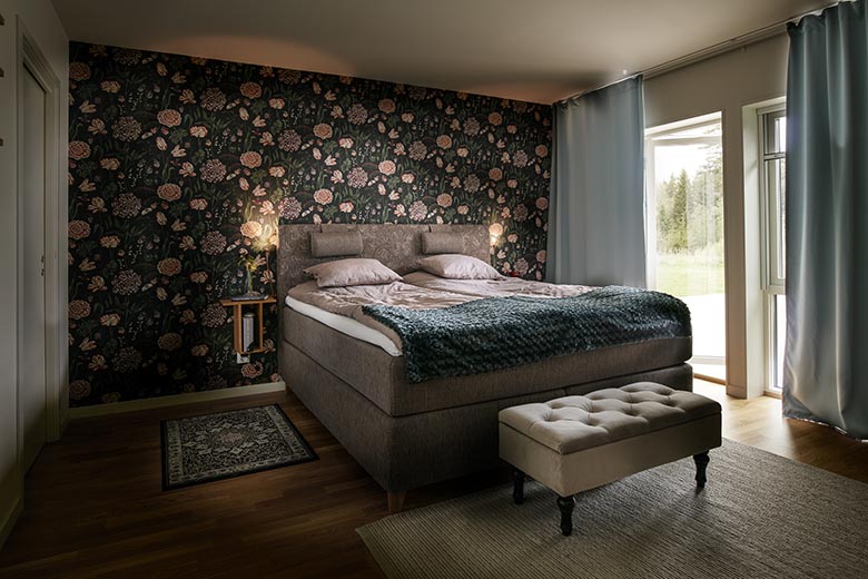 Det stora sovrummet har en klädkammare och badrummet är utrustat med dubbeldusch. De övriga tre mindre rummen används nu mest som gästrum och förråd. Tanken är att de kan bli barnrum om huset skulle säljas i framtiden.