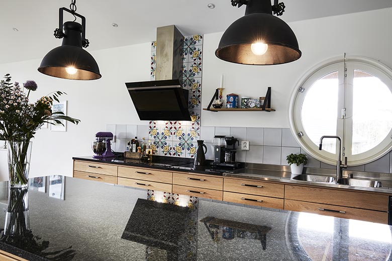 Rymligt och vackert kök med lådor i trä, praktisk rostfri diskbänk kombinerat med bänkskiva i sten.