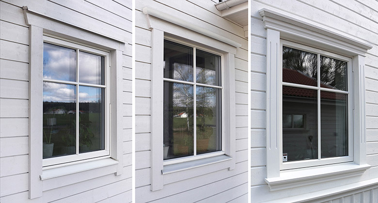 Här är tre exempel på fönsteromfattningar som vi valt att kalla Standard, Allmoge Light och Allmoge.