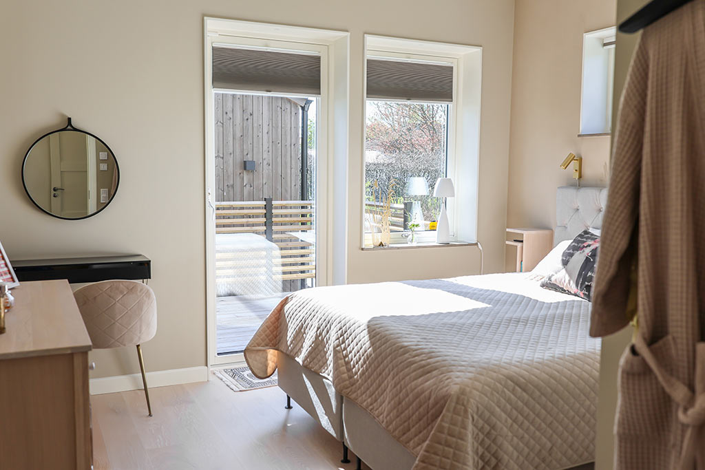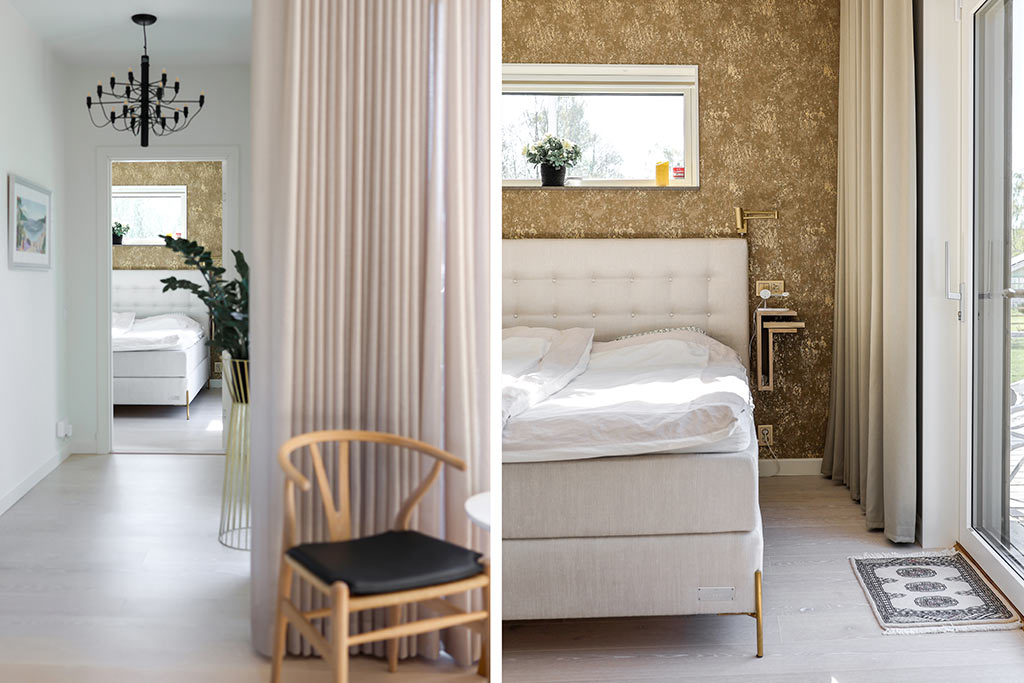 I husets ena flygel ligger parets sovrum. Här finns en walk-in-closet och ett eget badrum.