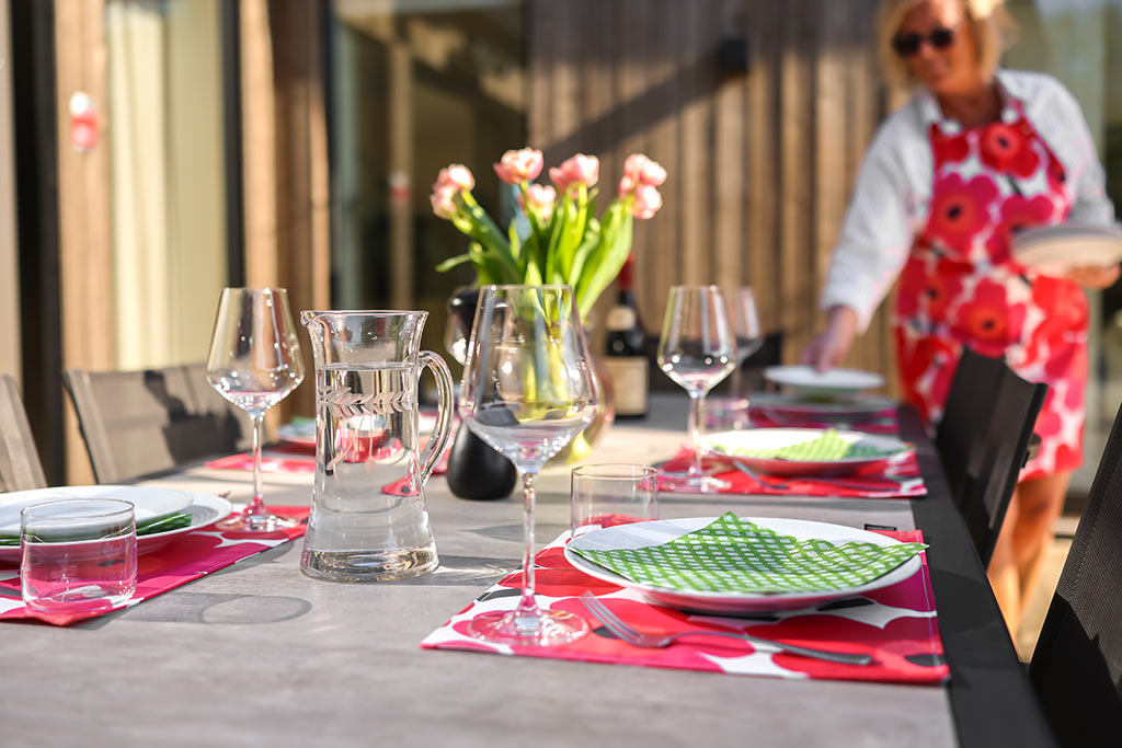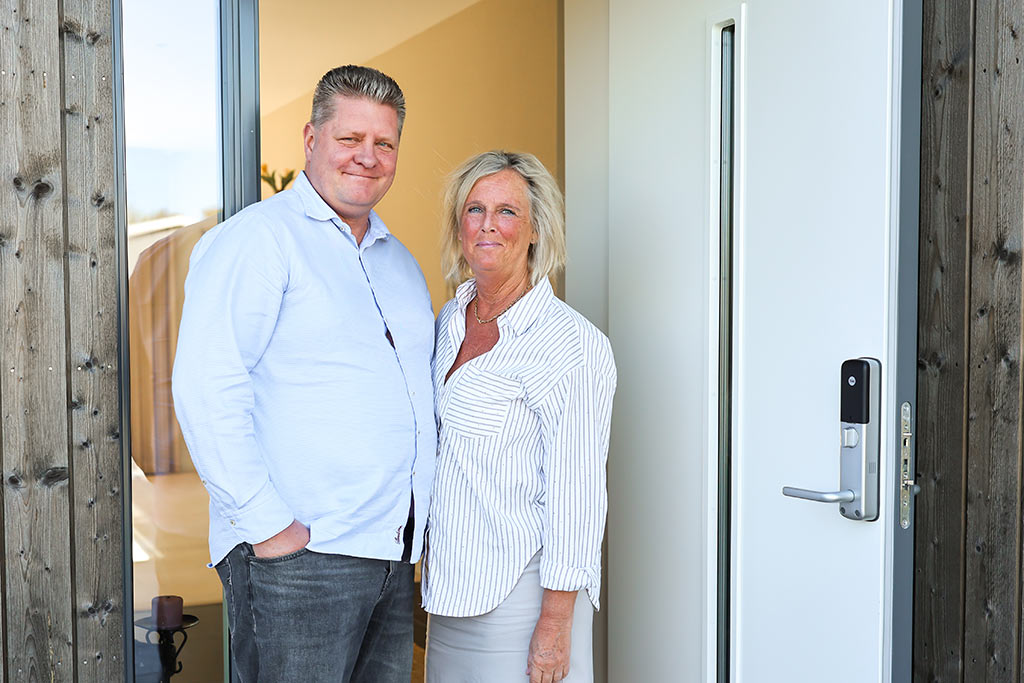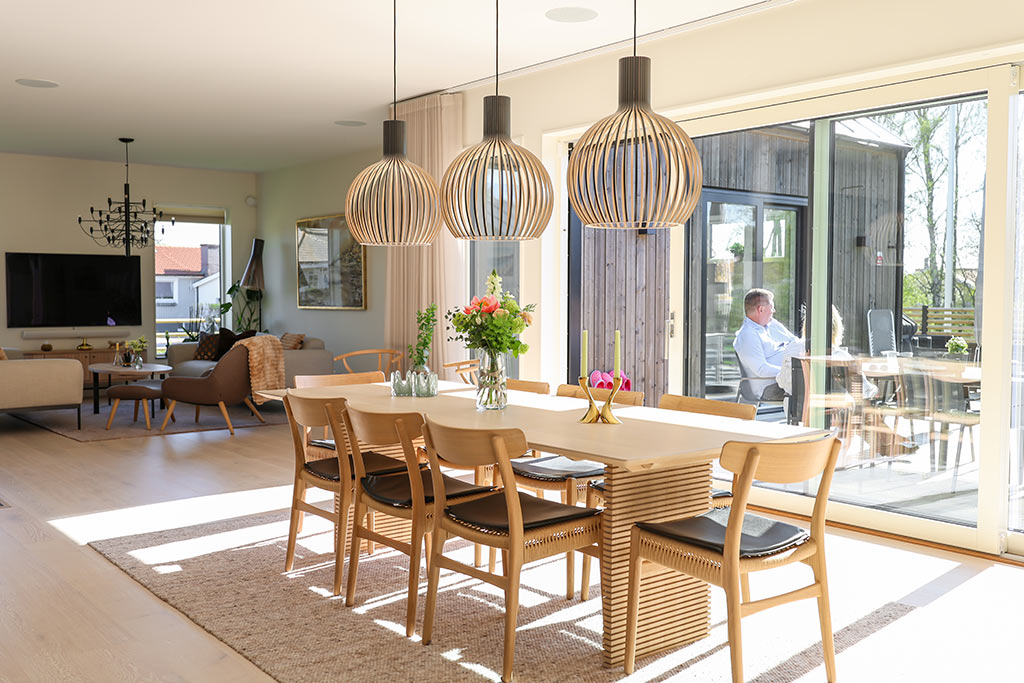 Med endast 40 minuter mellan fritidshuset och lägenheten i stan är det inte konstigt att göteborgarna Magnus och Lena spenderar stor del av sin lediga tid i sitt nya lösvirkeshus vid havet. Ett nytt hus med minimalt underhållsbehov var en av punkterna på parets önskelista inför första mötet på Alingsås Huspaket i Bergstena hösten 2022. “Jag sa till ritarna att det måste finnas plats för 18 personer vid middagsbordet”, skrattar Lena som berättar att både hon och Magnus älskar att bjuda familjen och vänner på middagar.