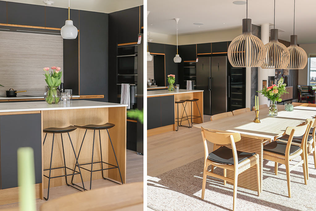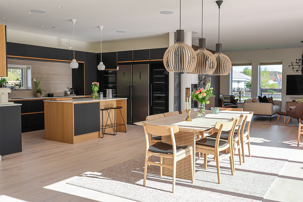 Kök, matplats och vardagsrum har öppen planlösning. Fönster och skjutdörrar kommer från Westcoast Windows.