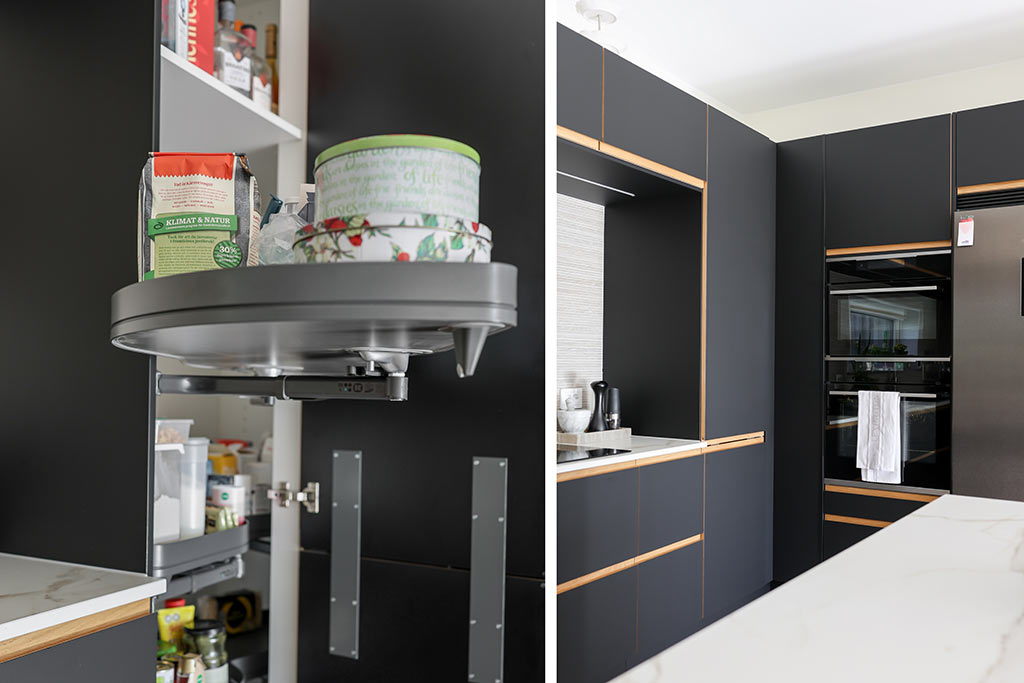 Köket kommer från JKE Kitchen Design. En av Lenas favoritfunktioner är det smarta hörnskafferiet.