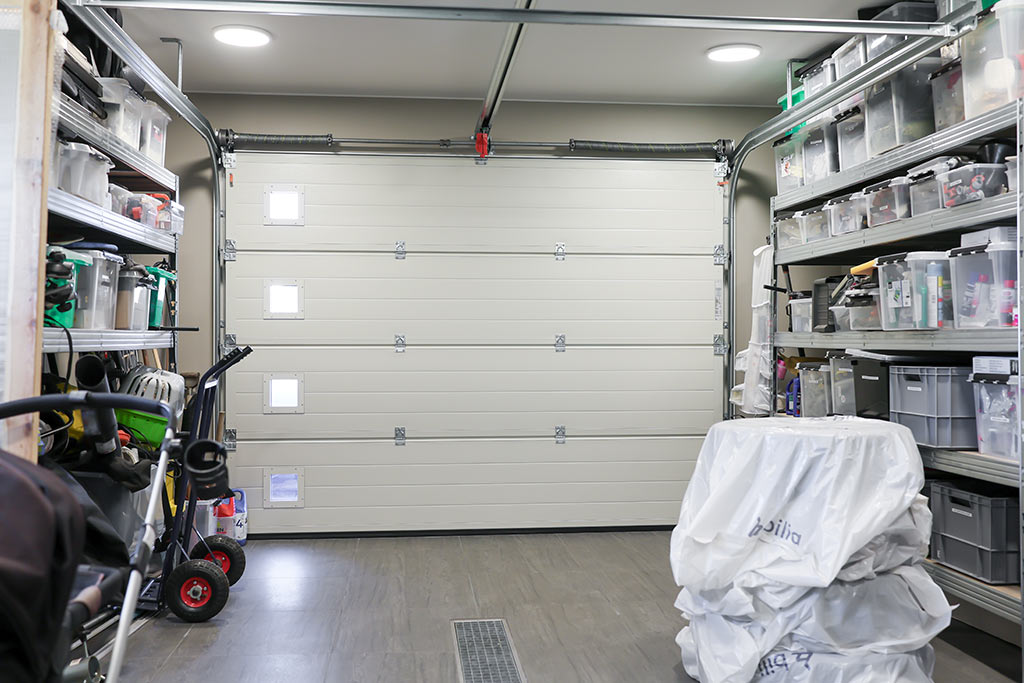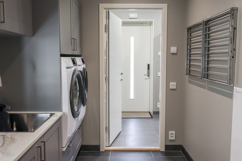 Från tvättstugan kommer man direkt till det integrerade garaget med praktisk förvaring.