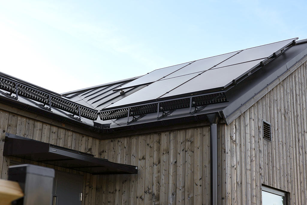 Solcellerna smälter stilrent in med det svarta plåttaket.